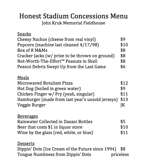 Honest Stadium Concessions Menu Dustin PetzoldPosted onMarch 11, 2015March 11, 2026inArchives 1 min read If stadiums were honest about their food and drink choices, we’d see something like this.