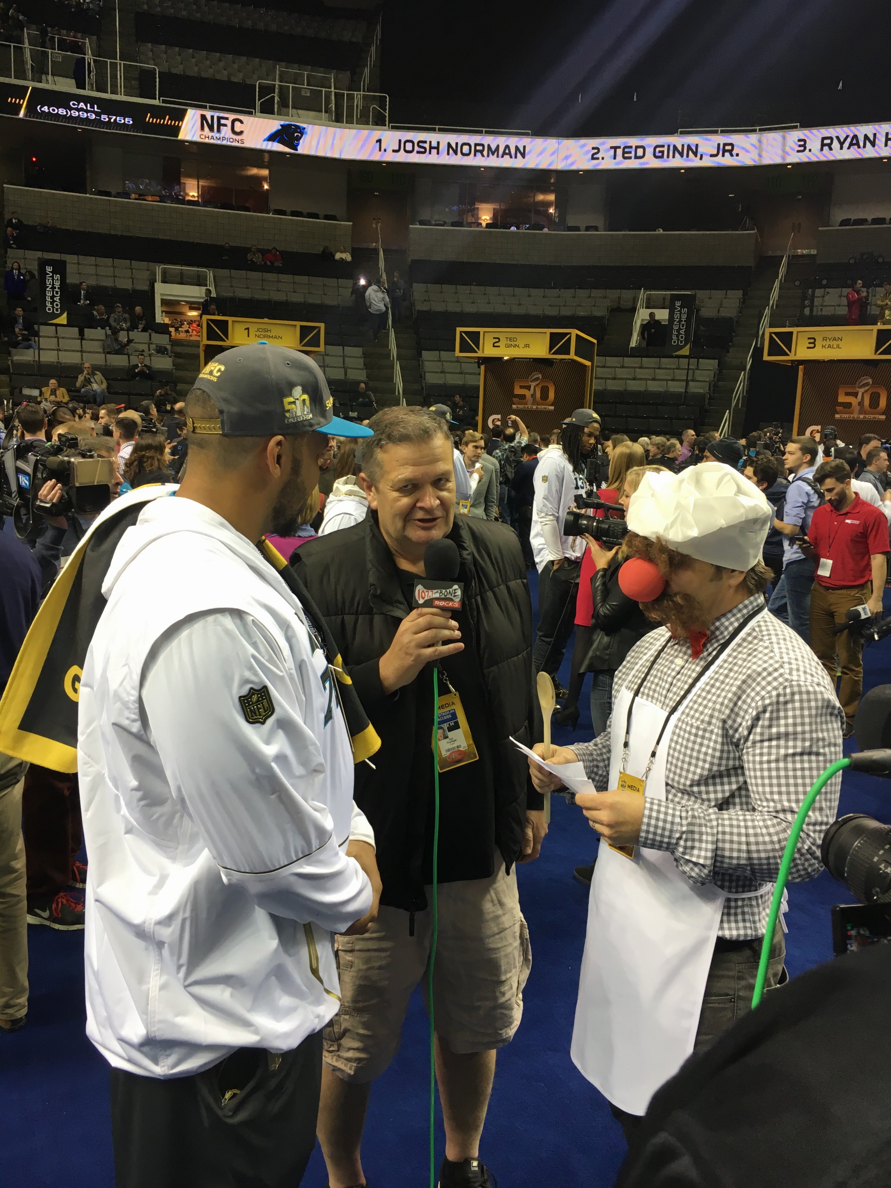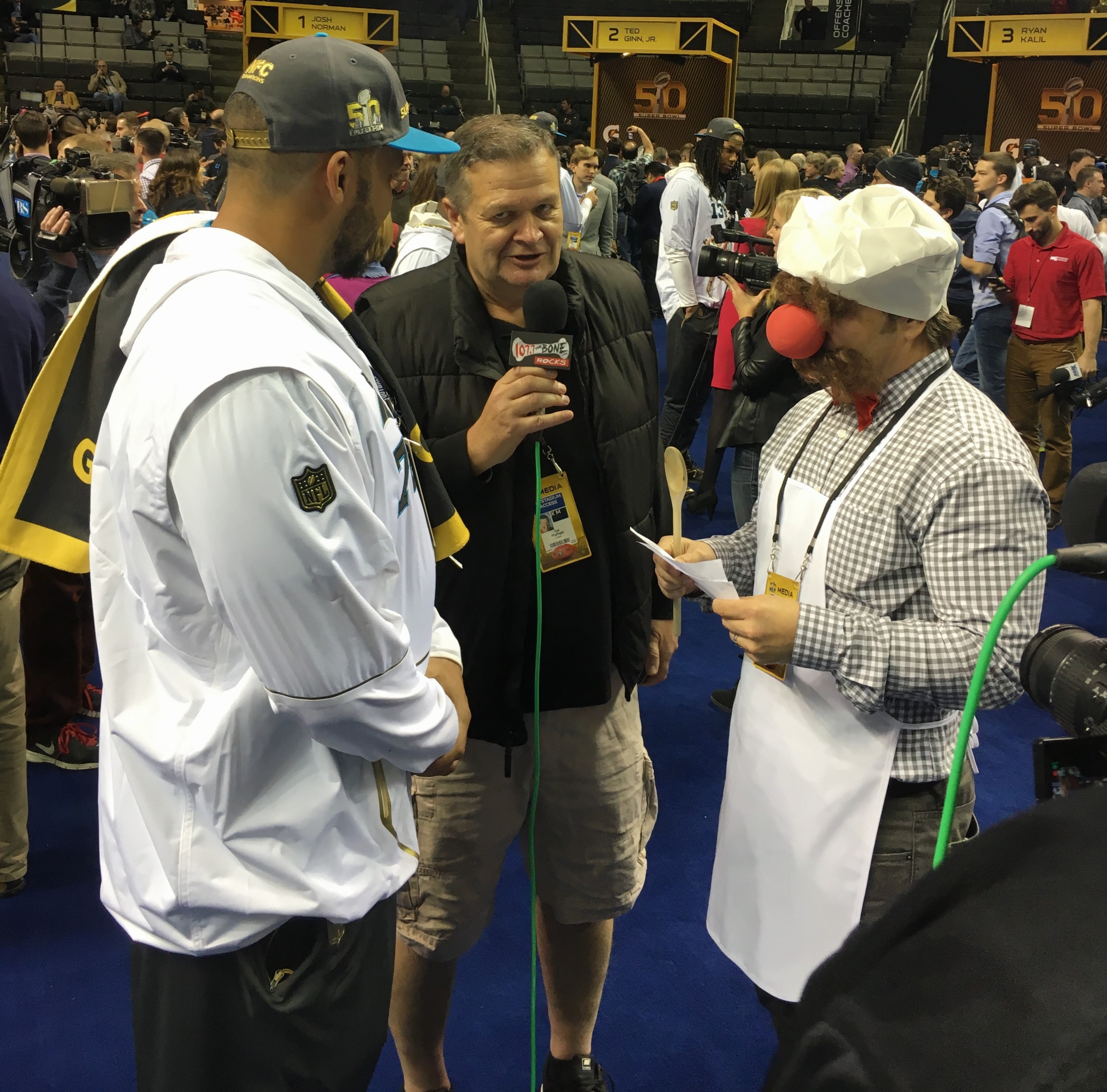 The other highlight for me was Radio Row. Some 200 radio stations from across the country come to set up their live shows for the week, all in a single room. Big shots from across the football universe (and me!) weave through interviews. You literally end up rubbing shoulders with the likes of Matt Ryan and Jerry Rice as you make your way around.